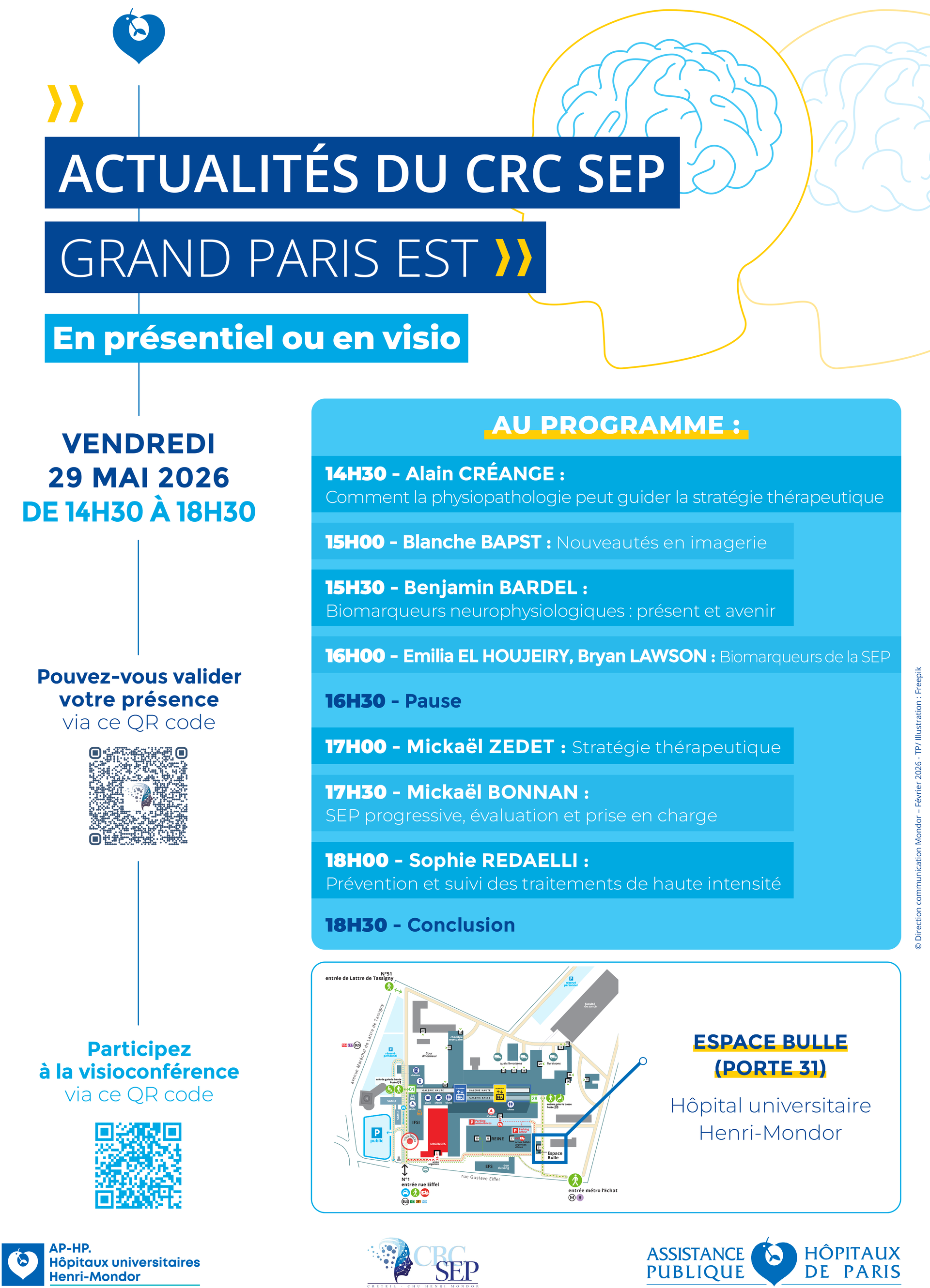 Le Centre de Ressources et de Compétence ( CRC) Paris Grand Est est situé au sein du CHU Henri Mondor. Il est dirigé par le Professeur Alain CREANGE . Il apporte différentes compétences nécessaires à la prise en charge des patients atteints de sclérose en plaques. Ses compétences sont utiles au stade de risque de la maladie, de stade de syndrome radiologiquement isolé, de syndrome cliniquement isolé, au stade initial, évolutif et tardif de la maladie. Les services rendus portent sur l’évaluation diagnostique, le conseil, le choix et le suivi des traitements de fond et symptomatiques, l’évaluation des comorbidités, le suivi de procédures thérapeutiques et la coordination des acteurs du parcours de soins, à travers des séjours d’hospitalisation de jour avec consultations pluriprofessionnelles. La coordination de l’approche pluriprofessionnelle y est effectuée. L’ensemble des thérapeutiques disponibles pour la sclérose en plaques, ou d’autres en investigations, y sont effectuées selon des modalités formalisées.